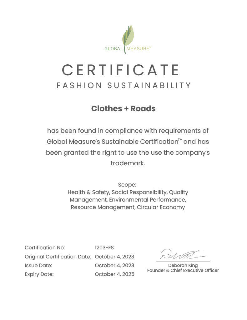 We're thrilled to announce that Clothes + Roads has been Certified Sustainable by Global Measure Inc.! Their comprehensive third-party evaluation covered every aspect of our brand, from our commitments to our supply chain transparency and production impacts. This thorough process has filled us with optimism for the future of sustainable fashion brands like ours.